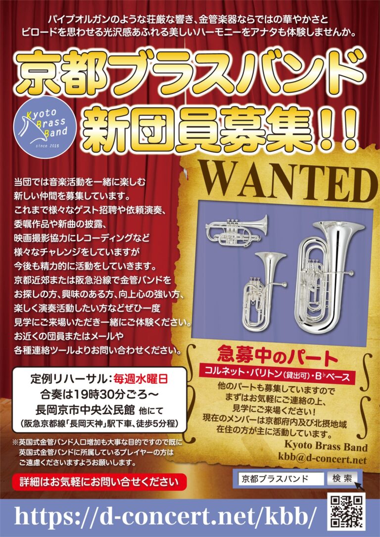 京都ブラスバンドでは2026年度の活動をともにするメンバーを募集いたします! 練習拠点は阪急京都線「長岡天神」駅付近の公民館にて水曜夜を中心に活動しています。 練習会場には無料駐車場も完備されています! 練習拠点の都合上、京都市内を含む京都府南部地域及び北摂地域のメンバーが多く在籍しています。 本番前には日曜練習が入りますことご了承くださいませ。 団費など詳しくは団員募集ページをご確認ください。 […]