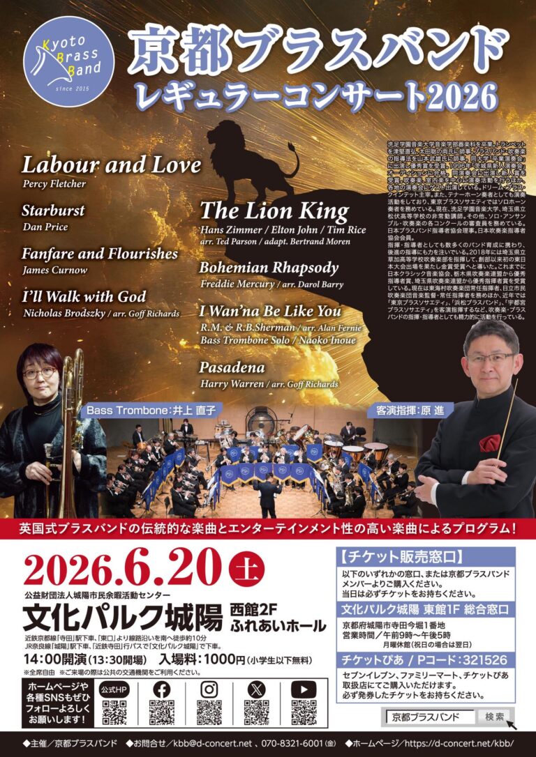 本年も客演指揮に原進先生を迎えてのコンサートとなります! 当団としては珍しく英国式ブラスバンドの伝統的なひな形に添ったプログラム構成でお届けいたします! チケットはお近くの団員もしくはチケットぴあにてお求めくださいませ。 またお問い合せより会場預かりとすることも可能です! ぜひ会場にてブラスバンドのサウンドをお楽しみください! ■京都ブラスバンド レギュラーコンサート2026 会場:文化パルク城陽 […]